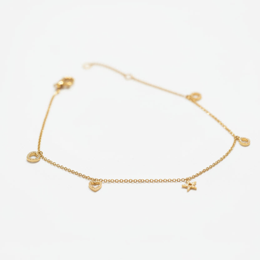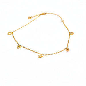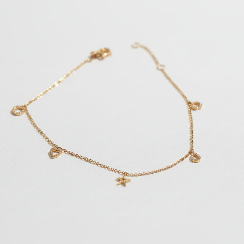 This elegant anklet features a 14K solid gold chain adorned with diamonds in varied geometric shapes, totaling 0.12 carats. Weighing 1.52 grams, it adjusts from 8.5" to 9" with a secure lobster clasp closure. Perfect for layering or wearing solo, this delicate piece combines timeless luxury with versatile styling.