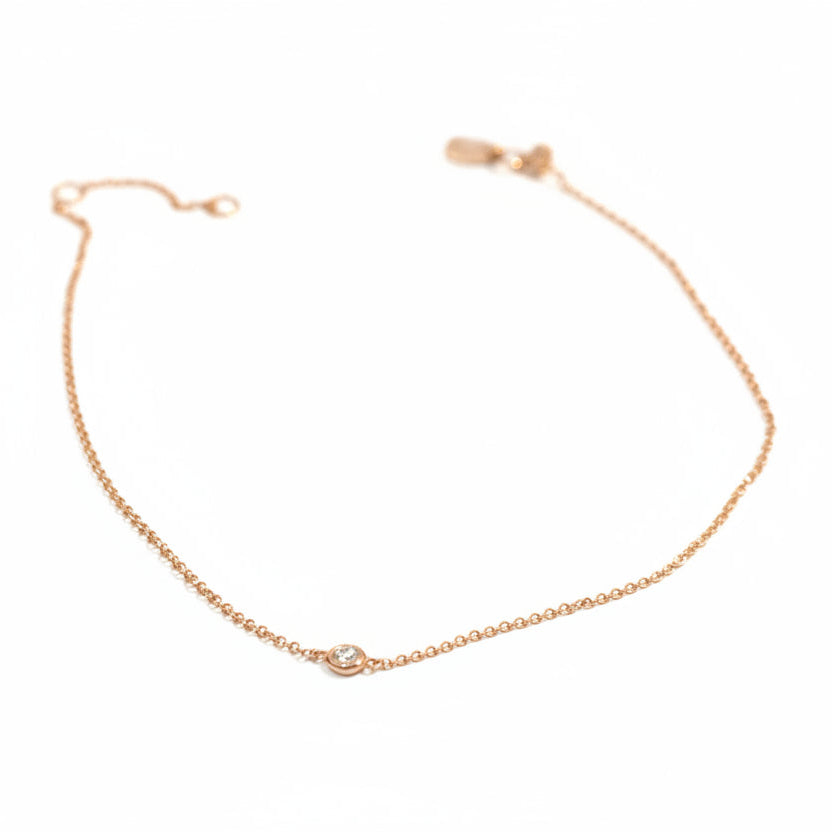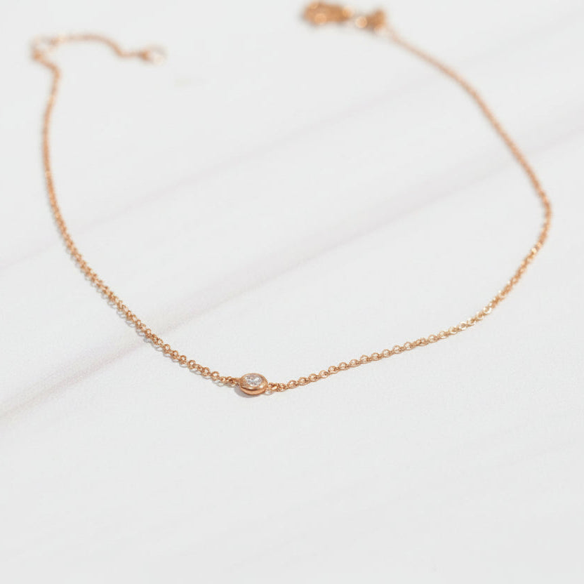 Elevate your everyday style with this delicate 14K solid gold anklet, featuring a stunning 0.05 carat diamond set in a secure bezel setting. The adjustable lobster clasp closure ensures a perfect fit between 8.5" and 9", while the refined chain design offers timeless elegance. Weighing 0.96 grams, this piece combines luxury with wearability—ideal for layering or wearing solo.