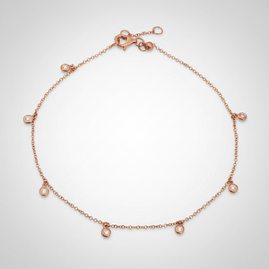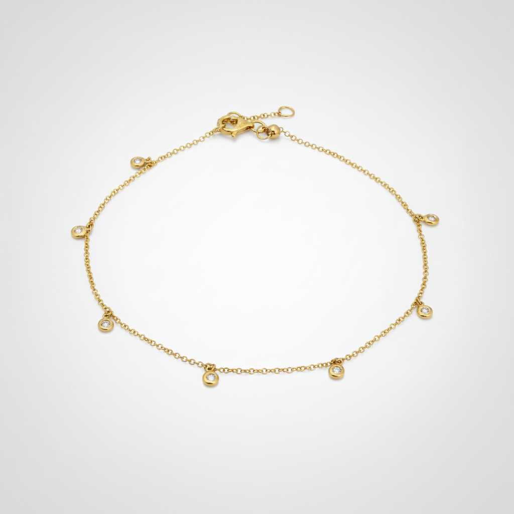 Elevate your everyday elegance with this sophisticated anklet featuring seven brilliant diamonds set in lustrous 14K solid gold. Each diamond is securely bezel-set, creating a timeless sparkle that catches the light beautifully. The adjustable lobster clasp closure ensures a comfortable, secure fit between 8.5" and 9" in length. Weighing 1.51 grams of 14K gold with 0.12 carats of diamond brilliance, this piece combines luxury craftsmanship with wearable comfort—perfect for layering or wearing solo.