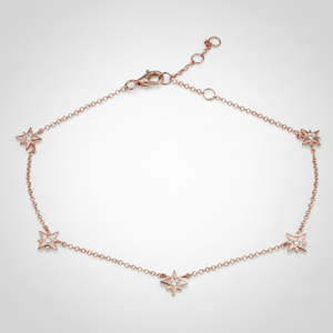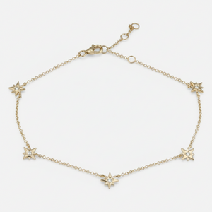 This elegant anklet features five six-point diamonds delicately set along a 14K solid gold chain, totaling 0.09 carats of sparkling brilliance. The adjustable lobster clasp closure ensures a secure, comfortable fit between 8.5" and 9" in length. Weighing 1.97 grams of pure 14K gold, this piece combines timeless sophistication with everyday wearability, making it the perfect accent to any jewelry collection.
