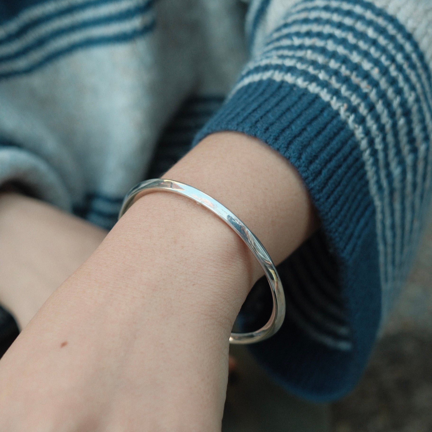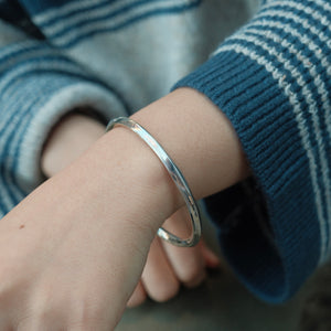 Sleek silver bangle with a knife edge design, measuring 5mm wide by 60mm in diameter. A timeless, minimalist piece that works beautifully on its own or layered with other bracelets.