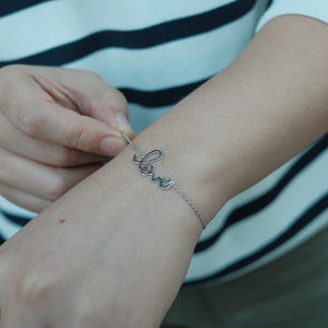 A beautiful love bracelet with 14k gold plating over silver, designed to fit comfortably at 7 inches long. Choose your favorite finish from rose gold, yellow gold, or sterling silver. Simple, elegant, and perfect for everyday wear.