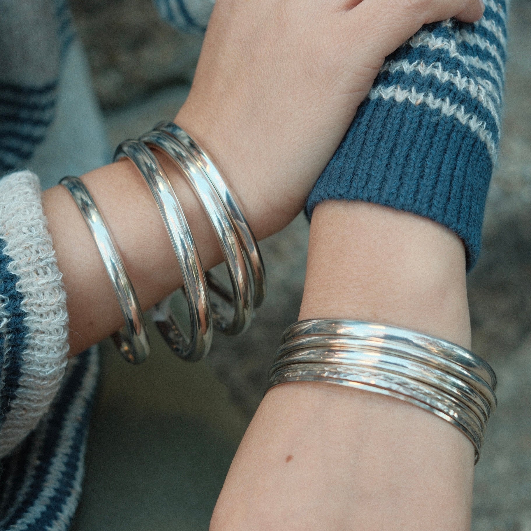 Elegant sterling silver bangle bracelet featuring a classic plain design. This set of six bracelets, each measuring 65mm in diameter, offers versatile styling options for everyday wear or stacking. Crafted from genuine sterling silver for lasting quality and timeless appeal.