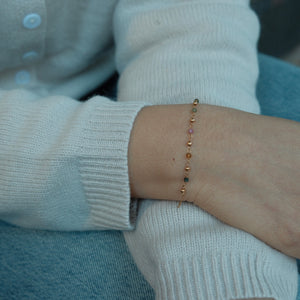This 7-inch bracelet features a 14K gold setting accented with tourmaline stones and a delicate cross design, combining elegance with meaningful detail.