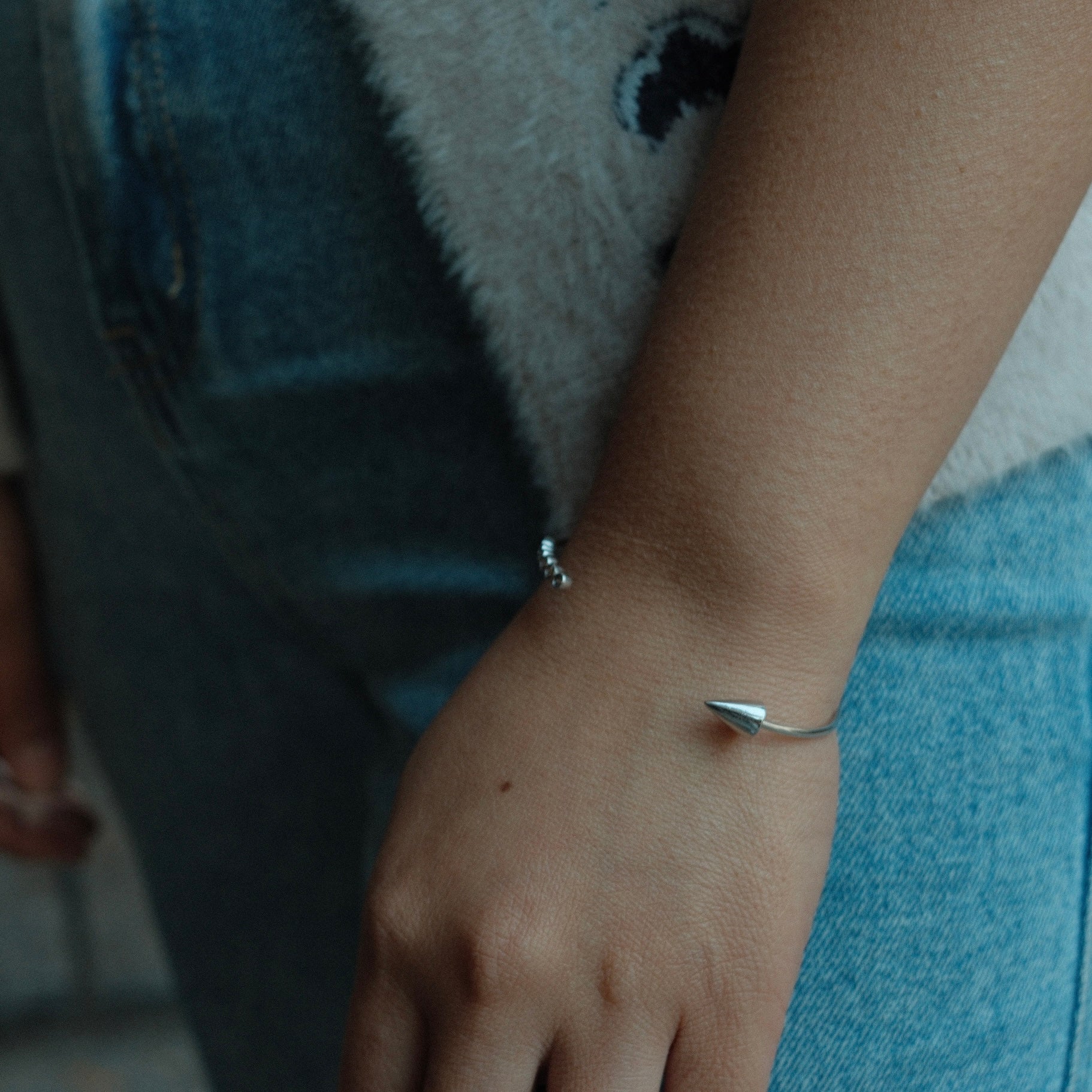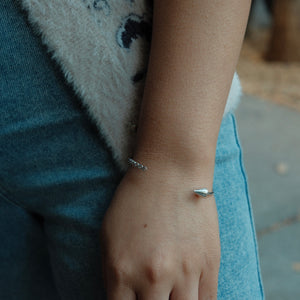 This open cuff bracelet, crafted from sterling silver, features a distinctive spike head adorned with Cubic Zirconia, combining elegance with effortless wearability.
