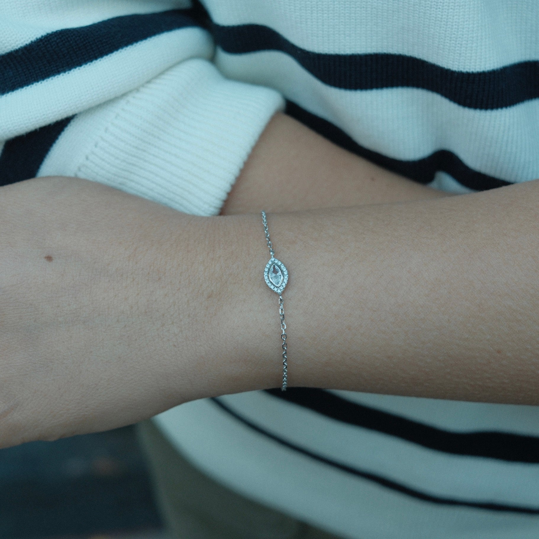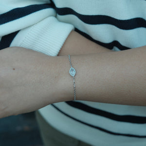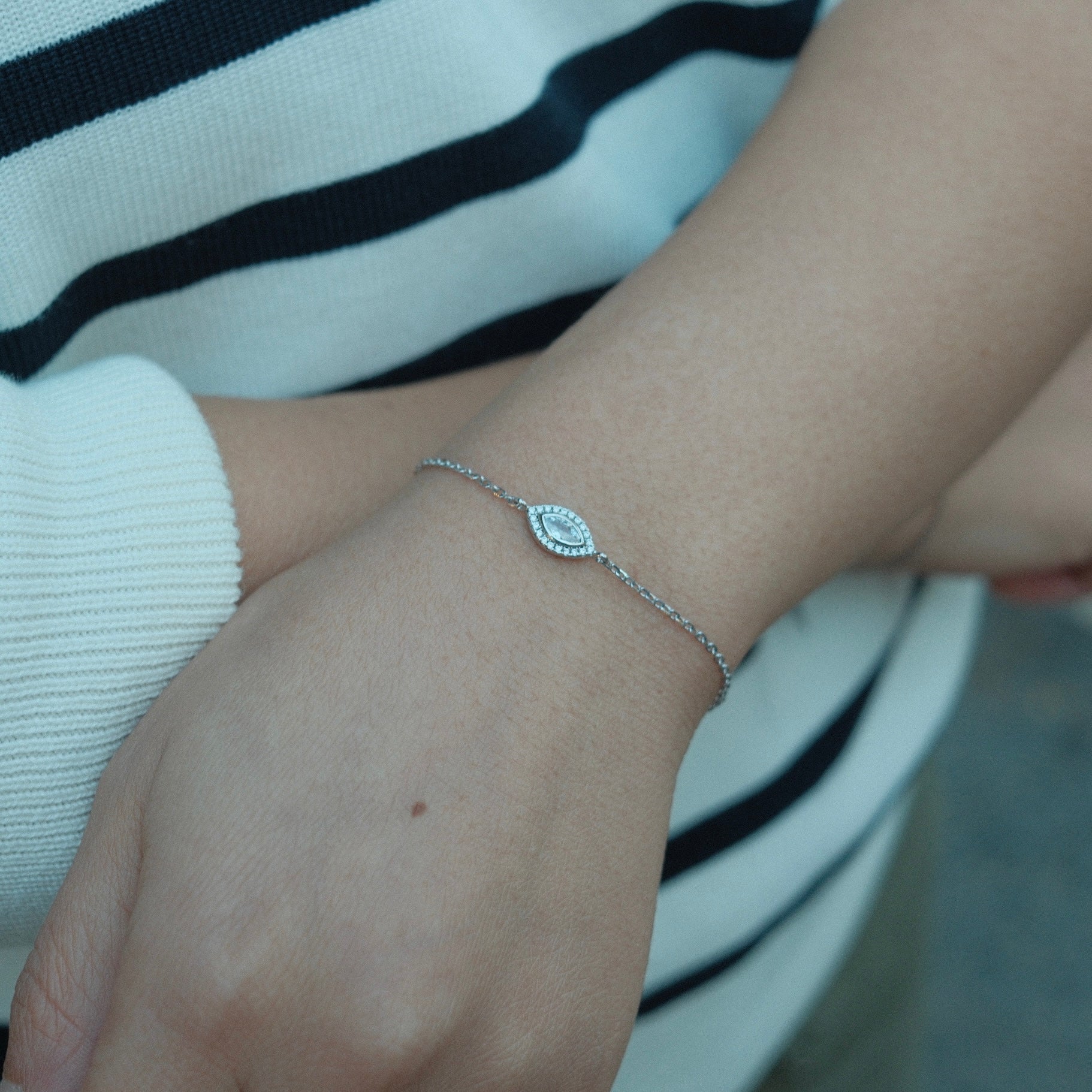 Crafted in sterling silver, this elegant bracelet features a striking evil eye motif adorned with shimmering cubic zirconia and vibrant turquoise accents. Measuring 7 inches, it combines timeless symbolism with refined craftsmanship, offering both aesthetic appeal and meaningful protection. A sophisticated accessory for those who appreciate jewelry with purpose.