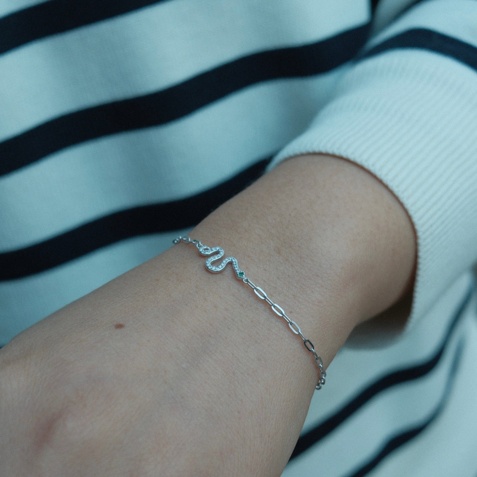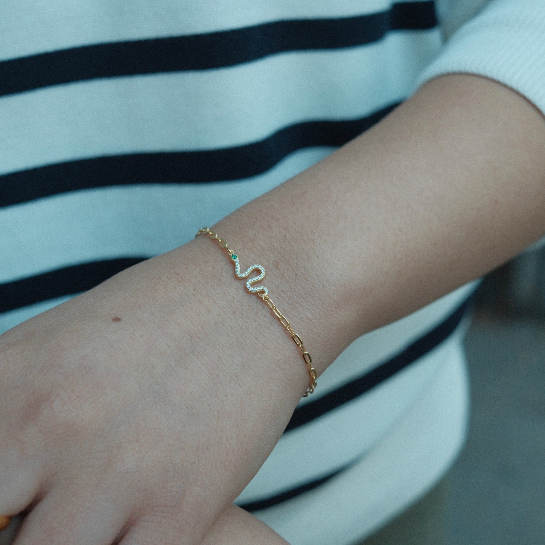 This elegant snake bracelet combines sterling silver with a luxurious 14k gold plate, adorned with sparkling cubic zirconia stones. Sized at 7 inches for a refined fit, it's available in this gold-plated version or in polished sterling silver for understated sophistication.