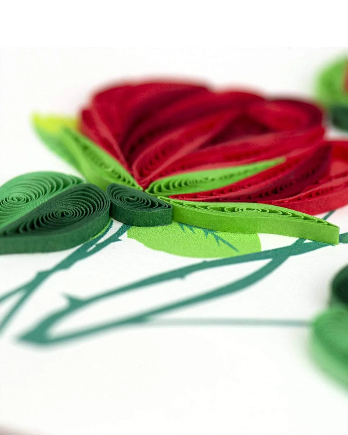 Express your love with the Quilled Red Roses Greeting Card for any romantic occasion! The quilled design features two red roses in full bloom, accompanied by rose buds and greenery. Whether for a birthday, anniversary, Valentine’s Day, or just to say “I Love You”, make a lasting impression with this handcrafted piece of art!