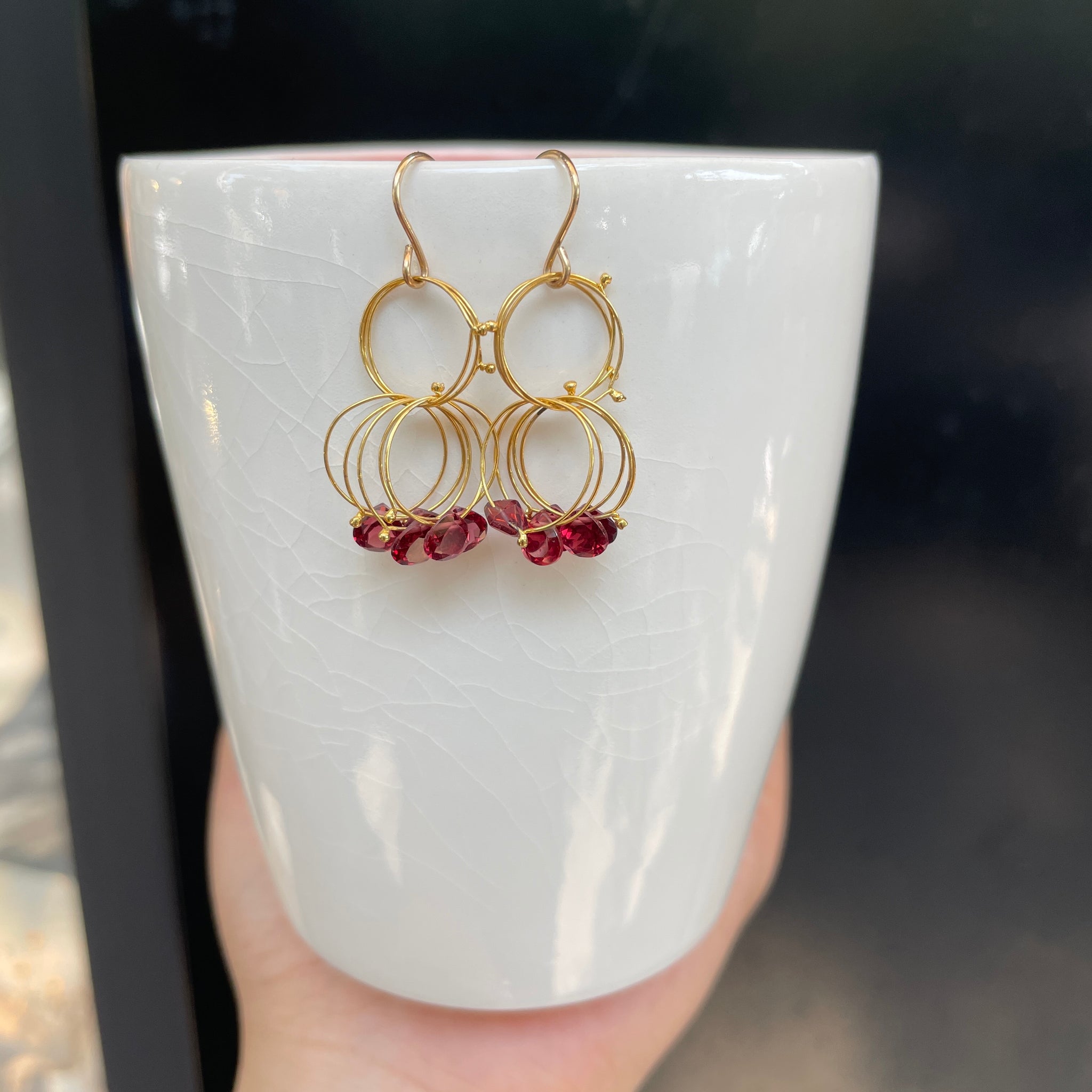 These handcrafted earrings feature multiple circle drops adorned with garnet, set in 14K gold-filled metal for an elegant and refined look.
