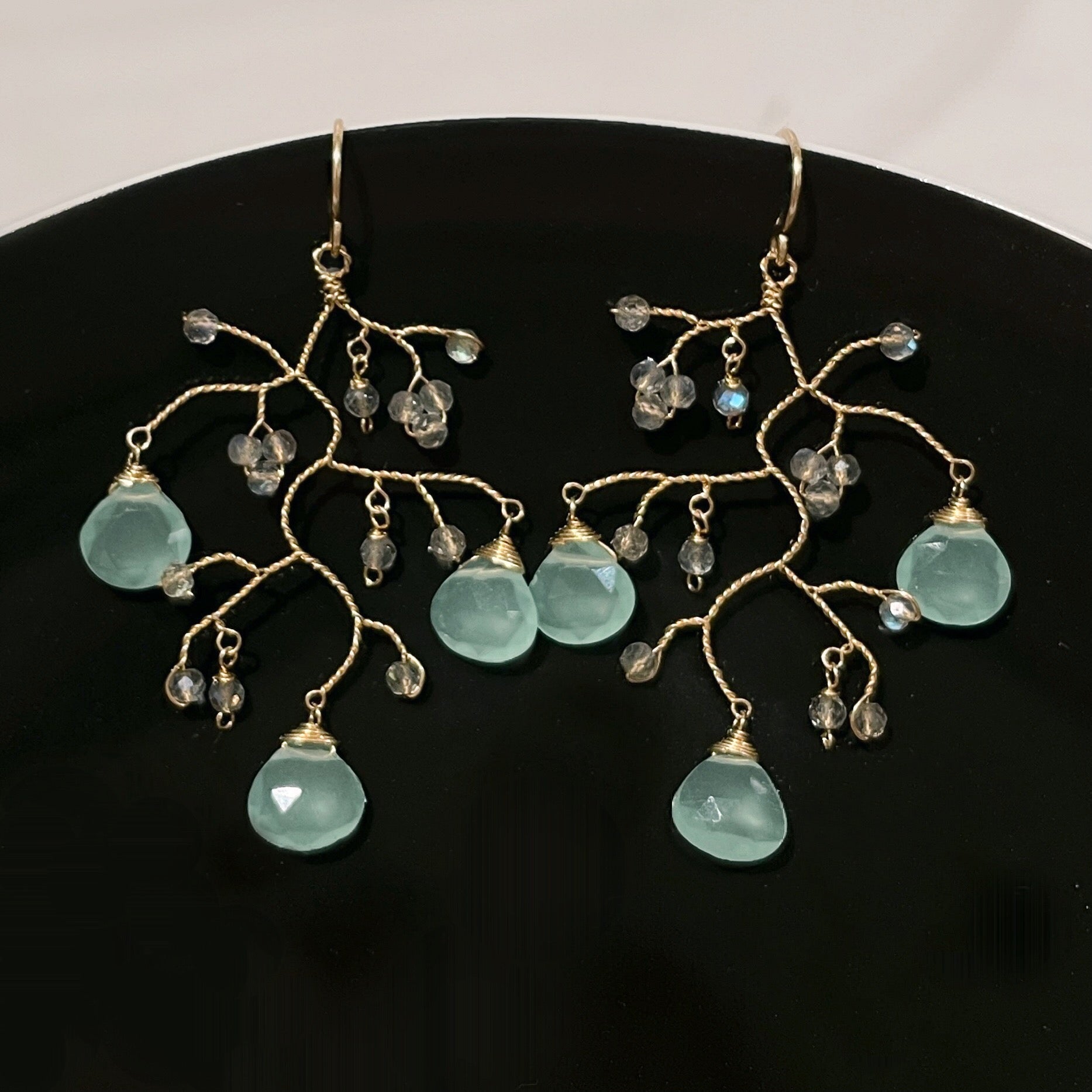 Delicate 14k gold filled earrings designed as branches, featuring Chalcedony and Labradorite gemstones, measuring approximately 1.5 inches in length.