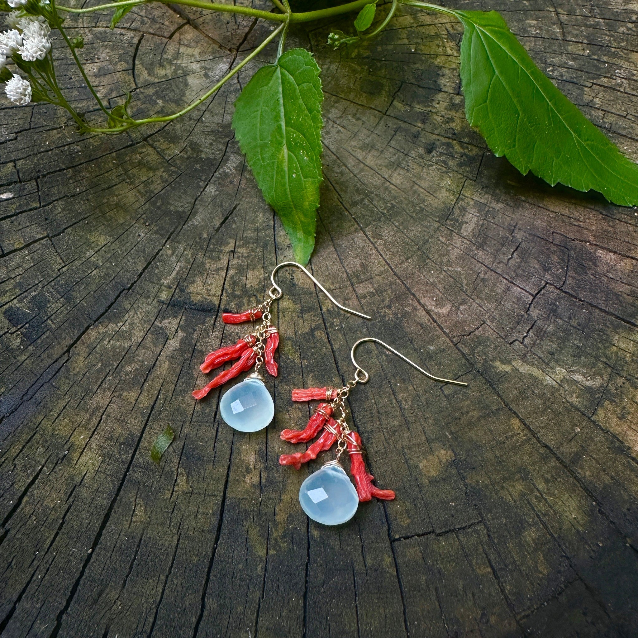These earrings are handcrafted with 14k gold-filled material and adorned with dainty Coral and Chalcedony stones for an understated look. The timeless design adds the perfect touch of sophistication that will add a refined touch to any ensemble.