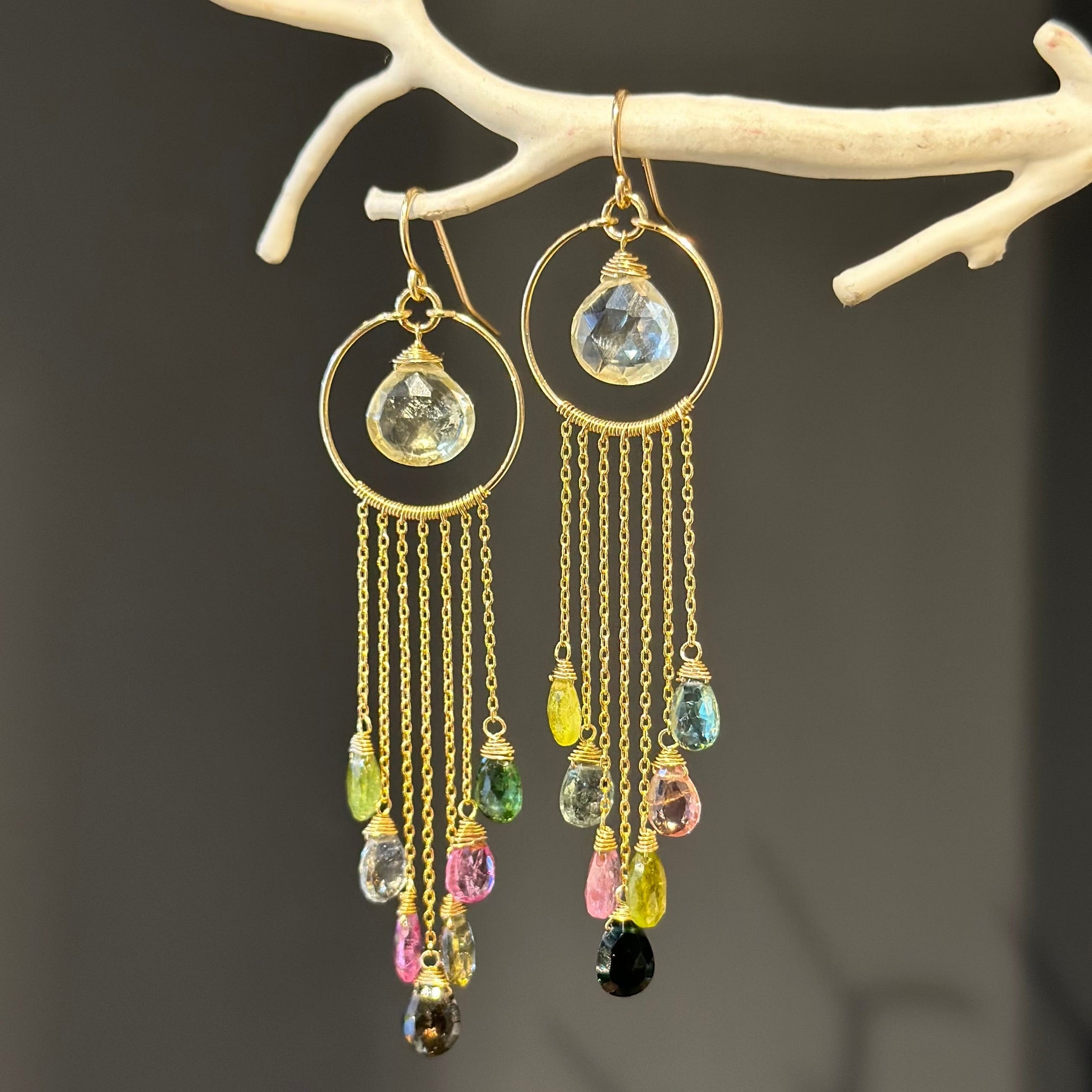 Crafted with skill and care, these earrings add a touch of elegance to any ensemble. Featuring 14k gold filled tassels with tourmaline stones, these handmade earrings will bring out your inner refined fashionista.