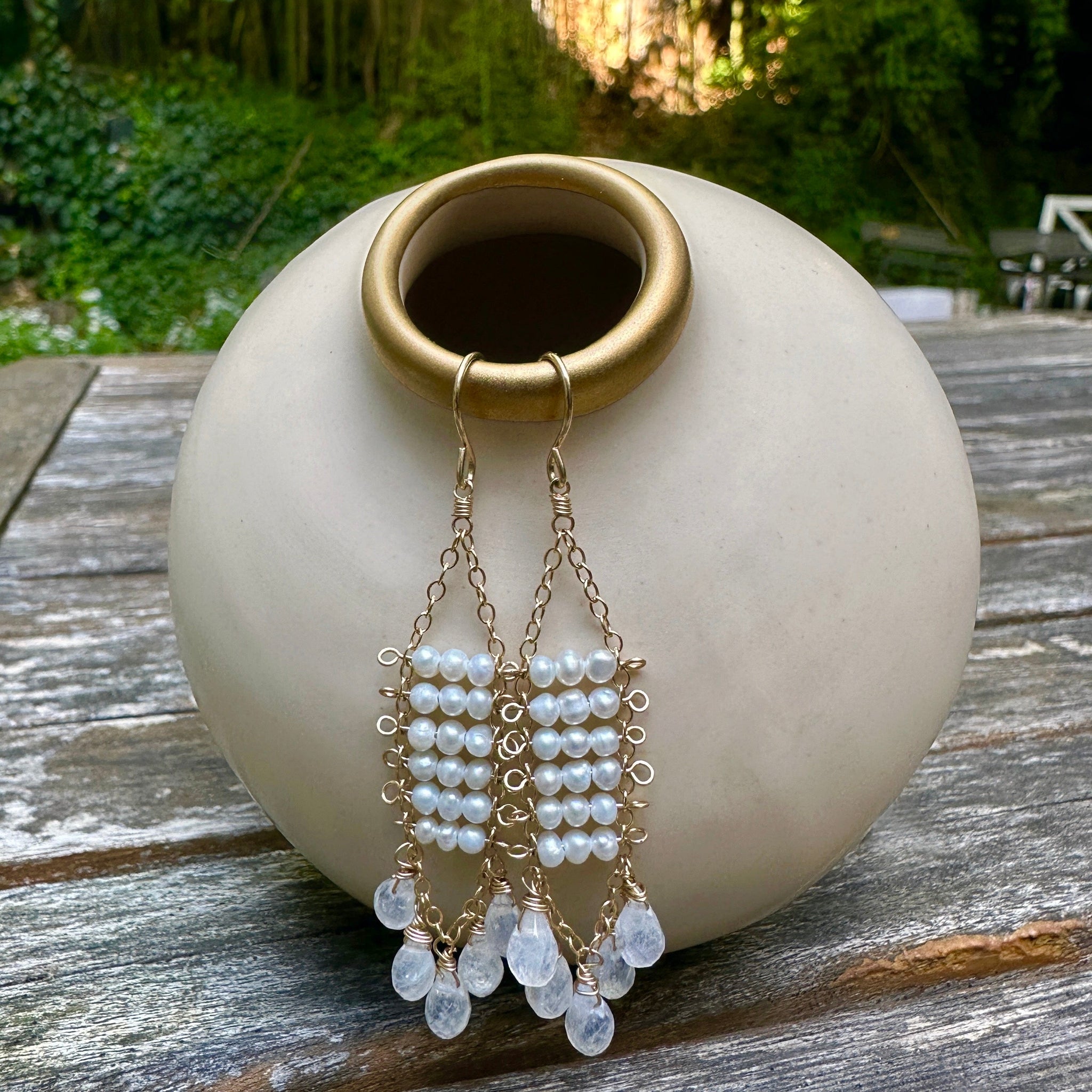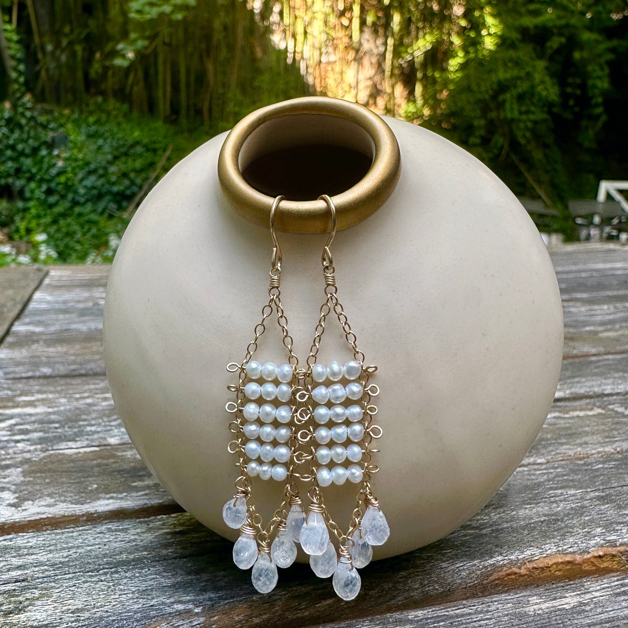 These earrings are handmade and delicately crafted with 14k gold filled metal. Sophisticatedly paired with Pearls and Moonstone drop, these earrings create an elegant tassel drop look. Perfect for completing any look or to gift a special someone!