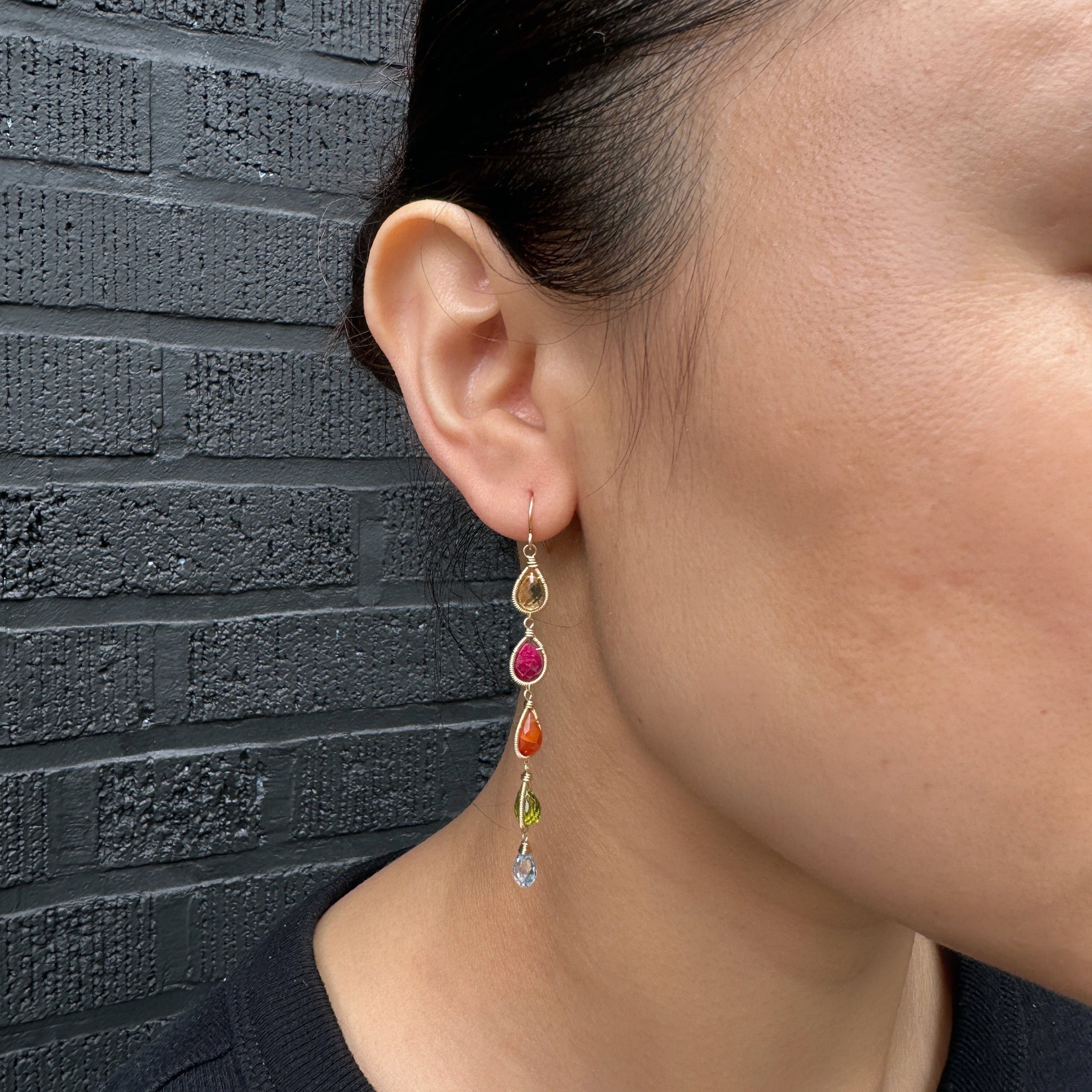 Crafted in New York with 14K gold-filled materials and adorned with gemstones such as Citrine, Ruby, Carnelian, Peridot, and Blue Topaz, this creation measures 2.5" in length.