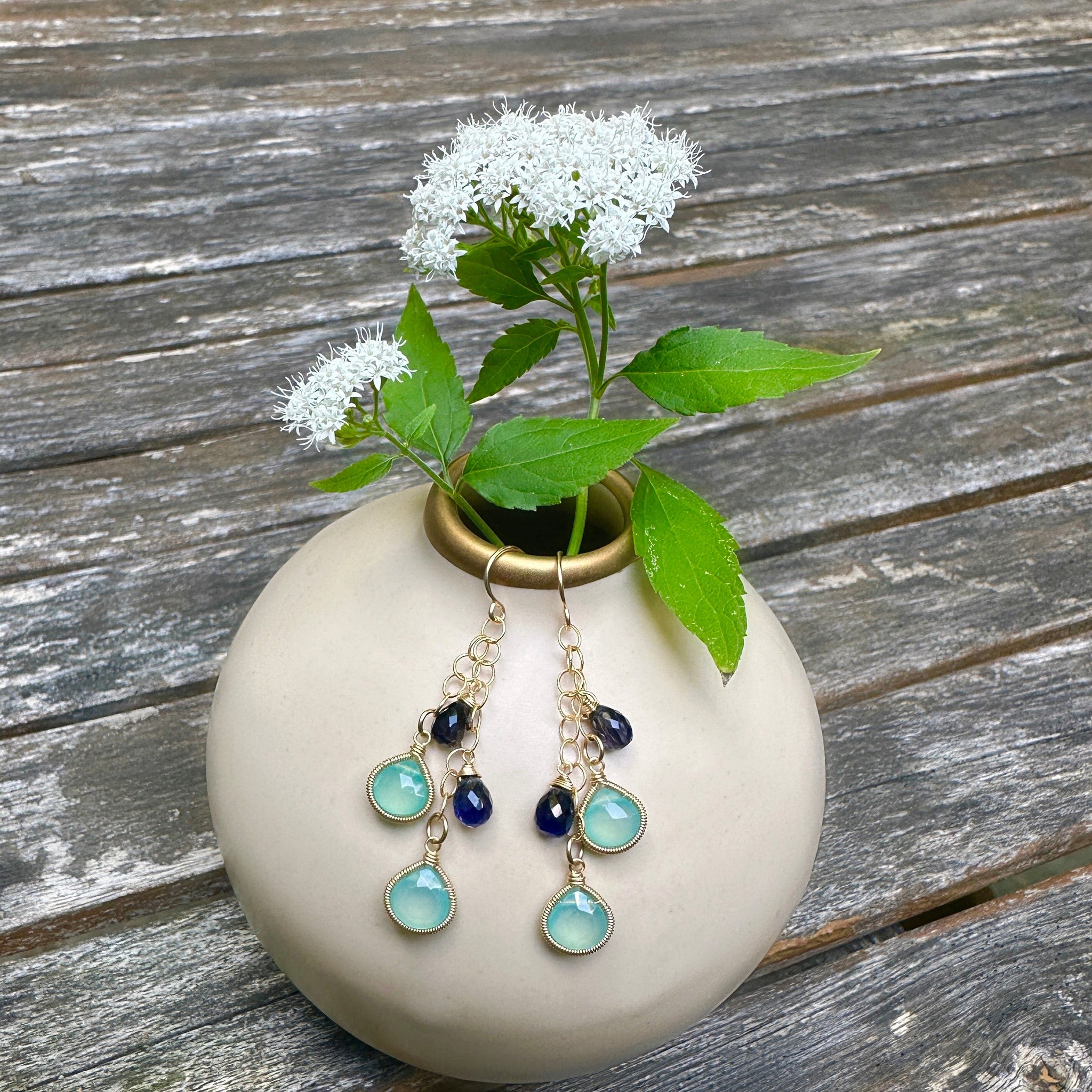 These earrings are statement piece designed for special occasions. Made from 14k gold filled material with a combination of Iolite and Chalcedony stones, these luxury earrings are perfect for making a subtle yet remarkable statement.