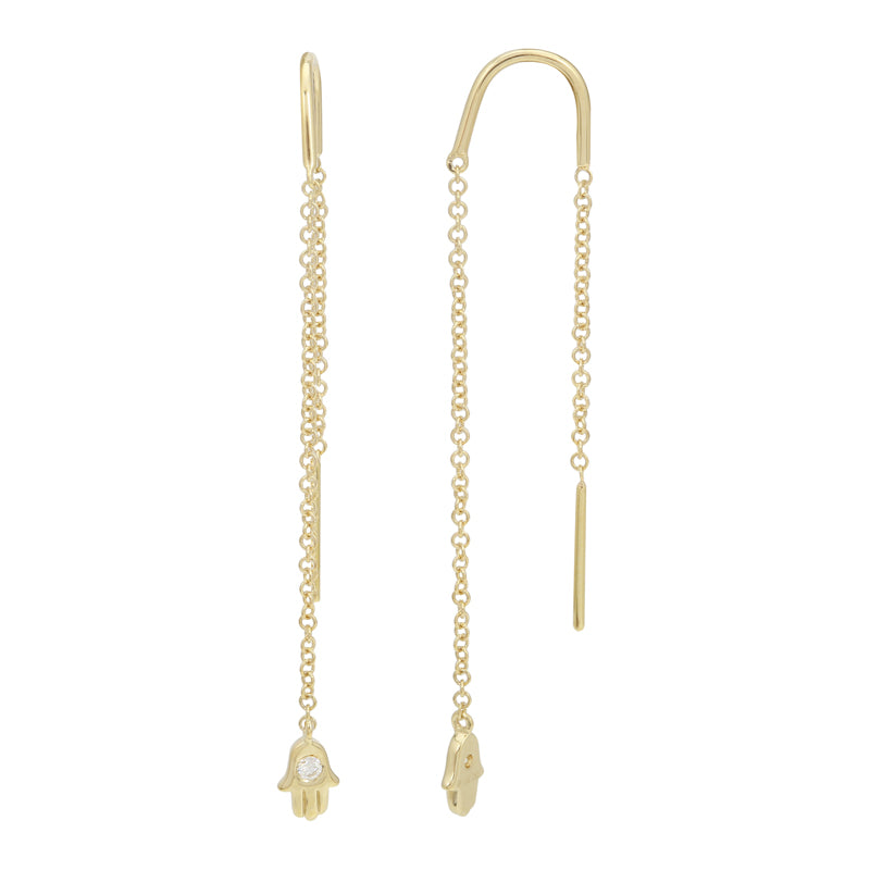 This 14k gold Hamsa threader features two round diamonds totaling 0.04ct and weighs 0.99gm. The Hamsa charm measures 4mmX6mm, with an overall length of 50mm for an elegant and refined look.