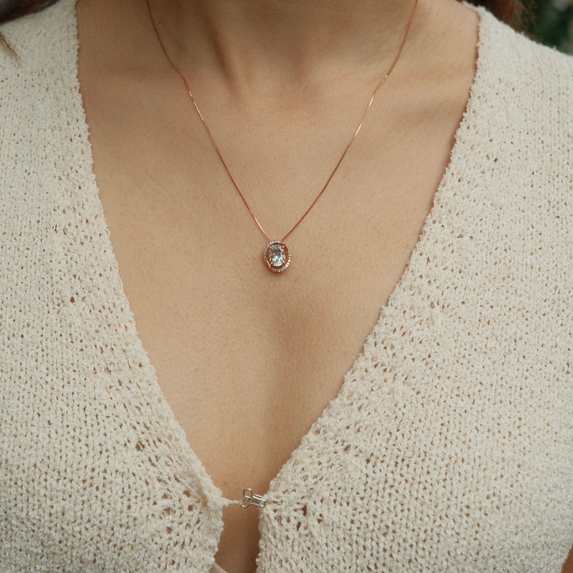 This elegant 14K rose gold necklace features an Oval Aquamarine pendant accented with 0.05 carats of Diamonds, elegantly suspended on an 18-inch chain.