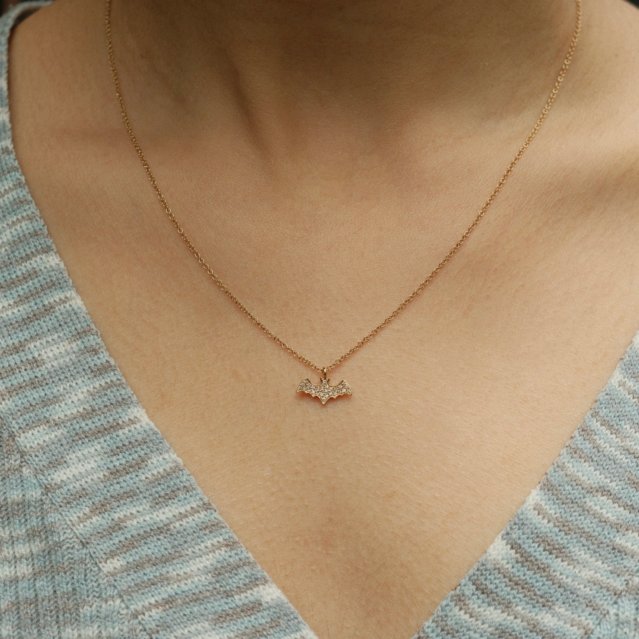 Crafted from 14K gold, this bat necklace features 28 diamonds with a combined weight of 0.06 carats and a total weight of 1.76 grams. The adjustable length of 16"-18" adds versatility to this stunning piece.