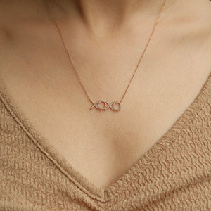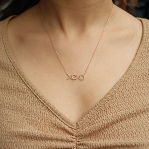 Elegant 14K gold XOXO necklace featuring a 0.20ct diamond, weighing 2.34 grams, with an adjustable length from 16 to 18 inches.