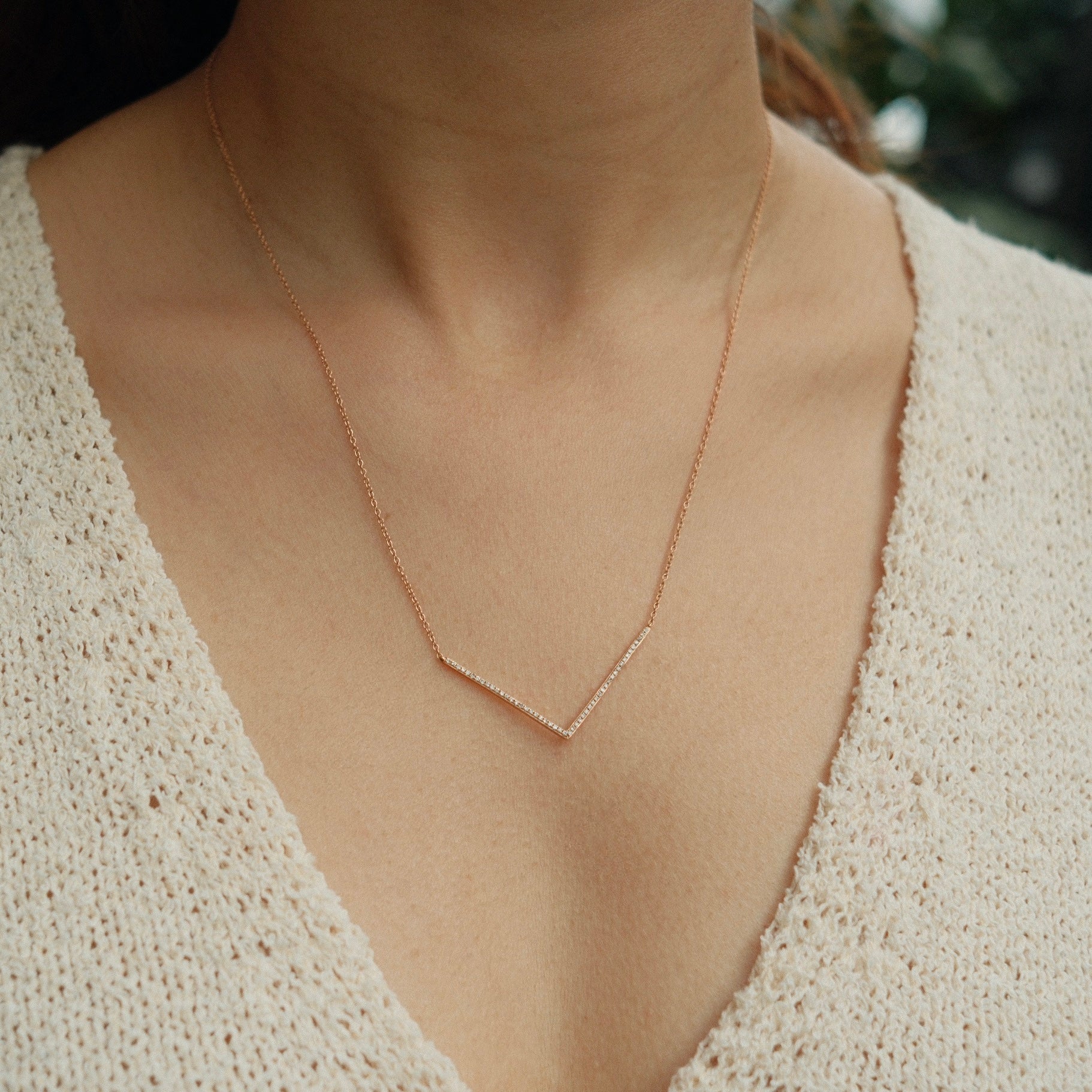 Delicately crafted 18K rose gold chevron necklace featuring 50 diamonds totaling 0.14 carats, adjustable from 16" to 18" in length.