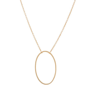 Simplicity and handcrafted elegance combine in the solo ellipse necklace, made from hand tapered, shaped and hammered wire. Suspended from delicate cable chain, the arcing lines of gold dance with reflected light. Handmade in recycled 14k gold with a satin finish, the pendant measures approx. 1" wide on a 16" chain with a spring ring clasp as shown on model.