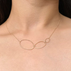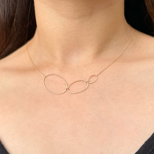 Simplicity and handcrafted elegance combine in the triple horizontal ellipse necklace, made from hand tapered, shaped and hammered wire. Suspended from delicate cable chain, the arcing lines of gold dance with reflected light. Handmade in recycled 14k gold with a satin finish, the three ellipses measure 2 1/4" across, and the necklace is 17” long with a spring ring clasp as shown on model.