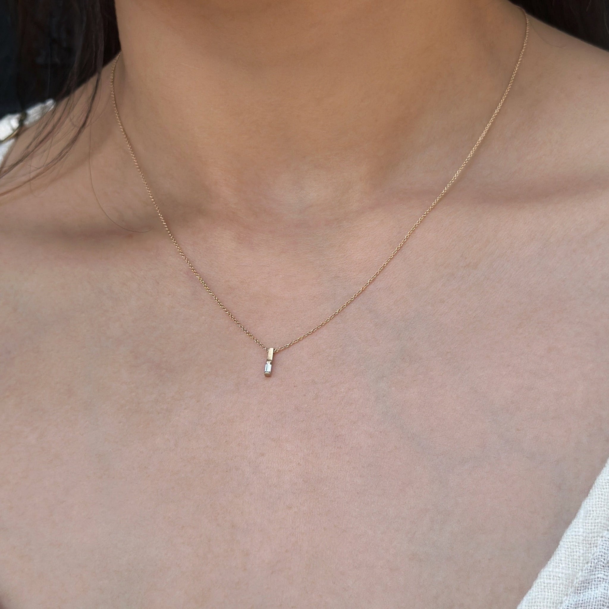 A refreshingly modern take on a timeless classic, this simple diamond pendant is understated yet eye-catching. The pendant is handmade in 14k gold with a satin finish, set with a .04ct, G-H color, SI1 clarity baguette diamond and strung on conflict free 14k 17”cable chain as shown on model. The pendant measures approximately 8mm long and 2mm wide. NK810+DIA