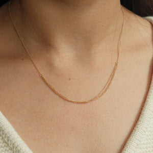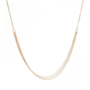 The horizontal tassel necklace features three strands of cable chain gathered and suspended gracefully between a single strand. This sultry necklace compliments a variety of necklines and you'll find yourself reaching for it again and again. Handmade in conflict free 14k yellow gold with a spring clasp, This necklace is 17” long.