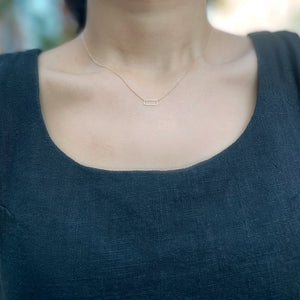 These mini shapes are understated yet pack a graphic punch. Perfect for everyday wear, the mini oval measures ⅜” wide by  ⅛” tall and is suspended by tiny gold jump rings on our signature conflict free 14k yellow gold cable chain. Handmade in recycled 14k gold with a satin finish. This necklace as shown on the model is 17” in length.