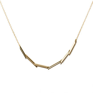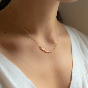 The Scaled Tubular Necklace has a delicate design with six angle-cut, highly reflective gold tubes linked by CCJ's signature cable chain. Its flexible nature mimics dragon scales, reflecting light with every movement. Handmade in 14k yellow gold and 17" long on the model.