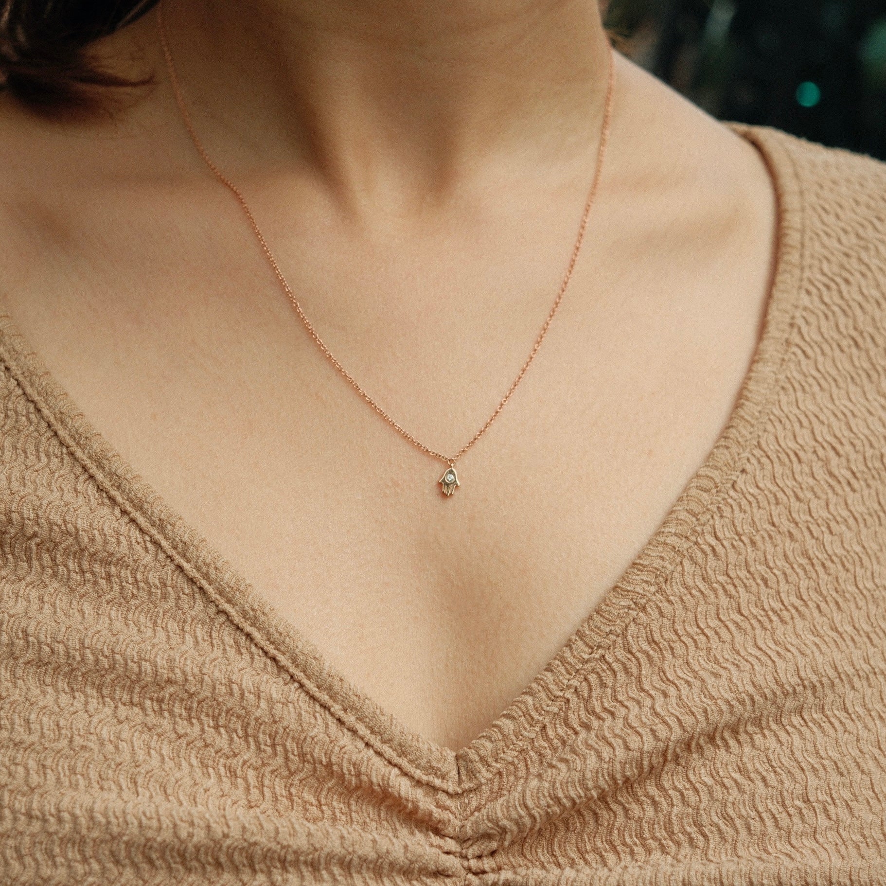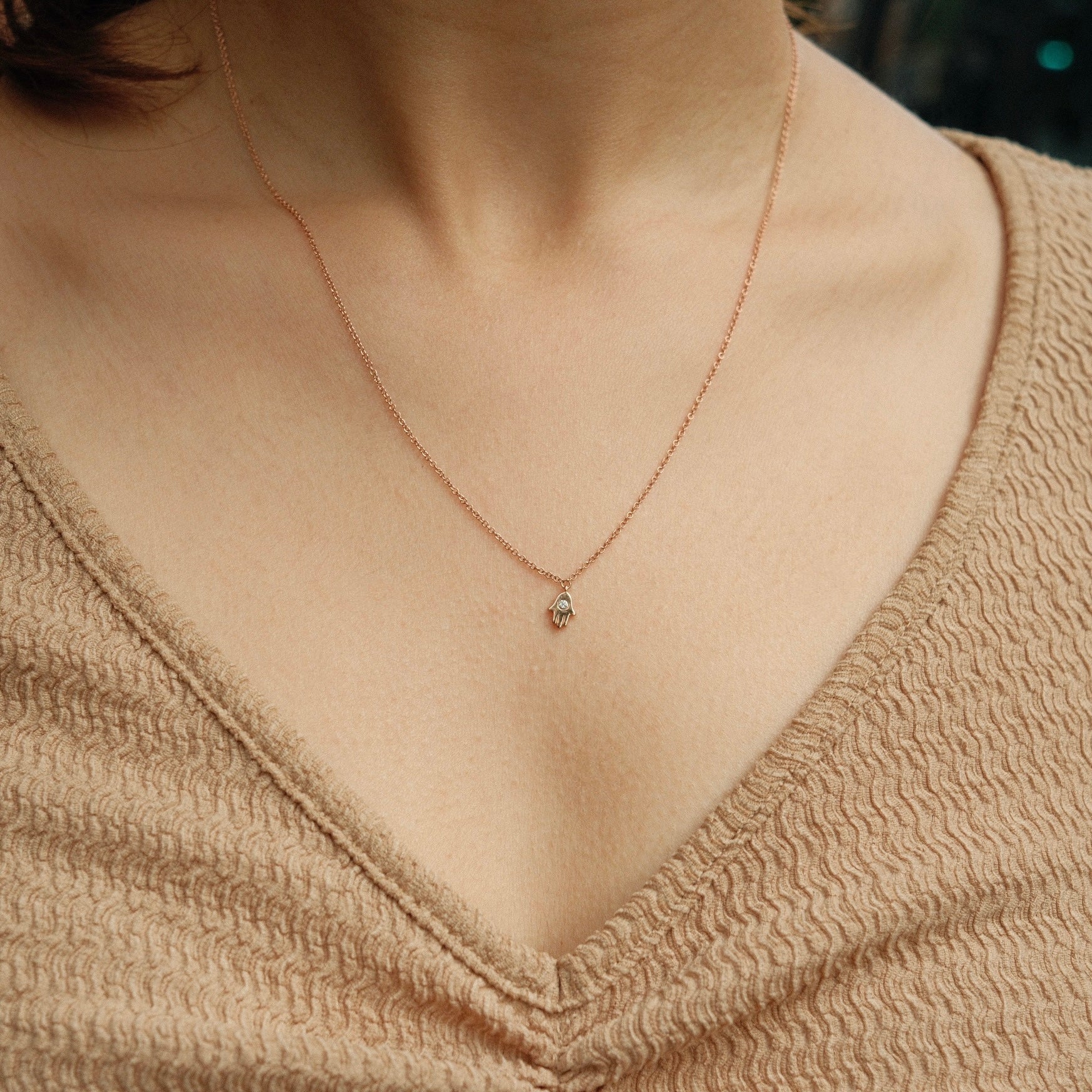 14k Rose gold mini Hamsa necklace with single Diamond, .02ct, 1.59gm, 16"-18" long