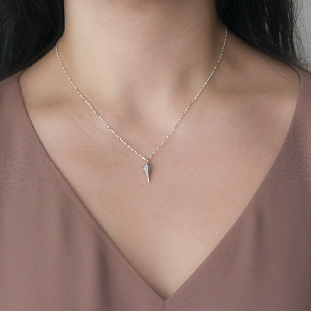 This sterling silver necklace showcases a beak pendant with an accompanying 12 pave diamond embellishments, measuring .06ct. The necklace is 16" long and the pendant stands at 5/8" H