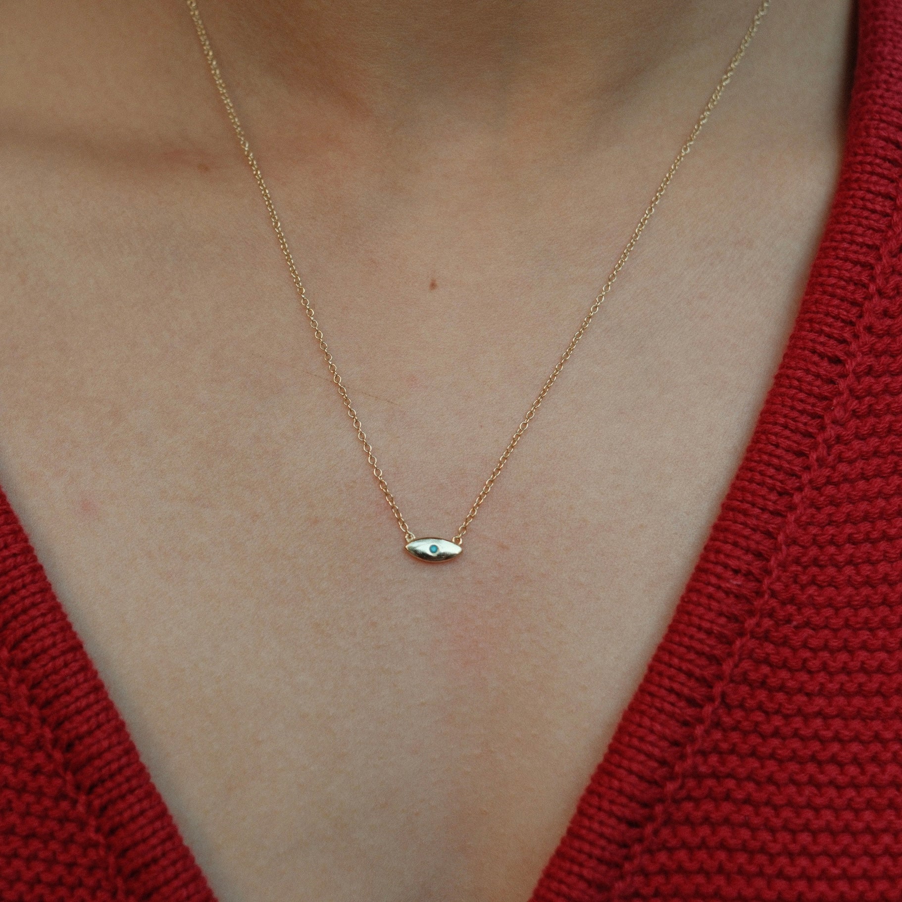 This elegant Evil Eye necklace features a sterling silver base plated with 14K gold, adorned with a single blue Cubic Zirconia. Adjustable between 16" and 18" for a perfect fit.
