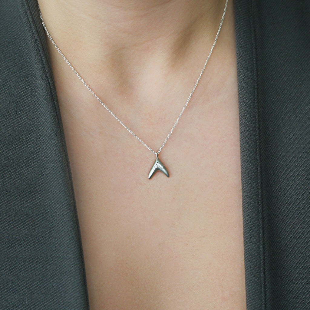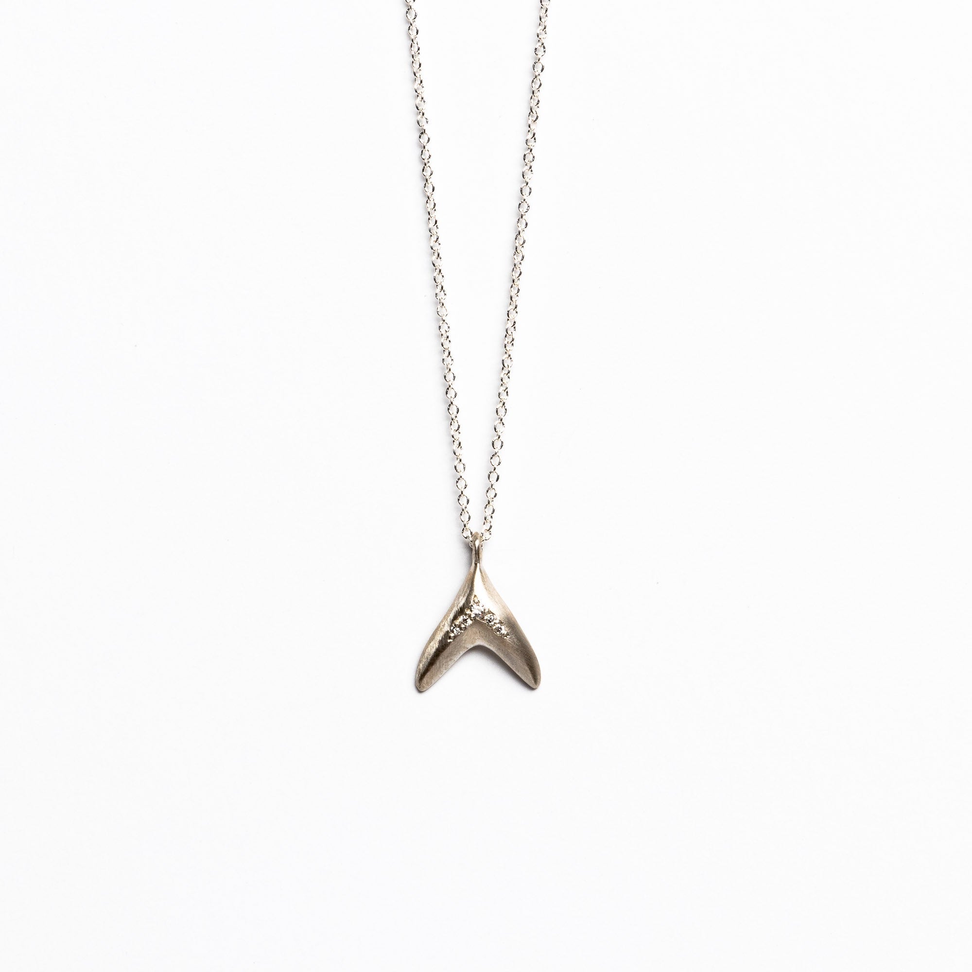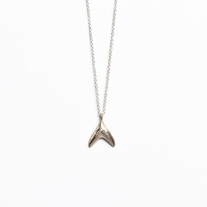 This pendant necklace with a fin-shaped design is crafted from Sterling silver and 5 white diamond stones for a total carat weight of .025ct. Its height measures 5/8" and the necklace is 16" long