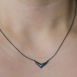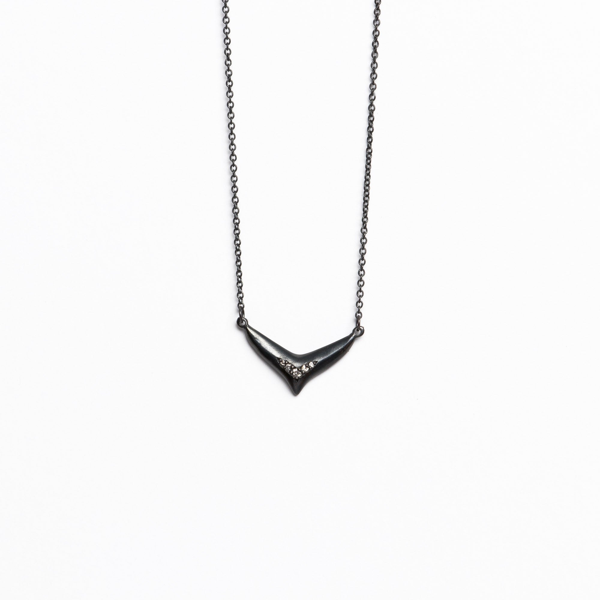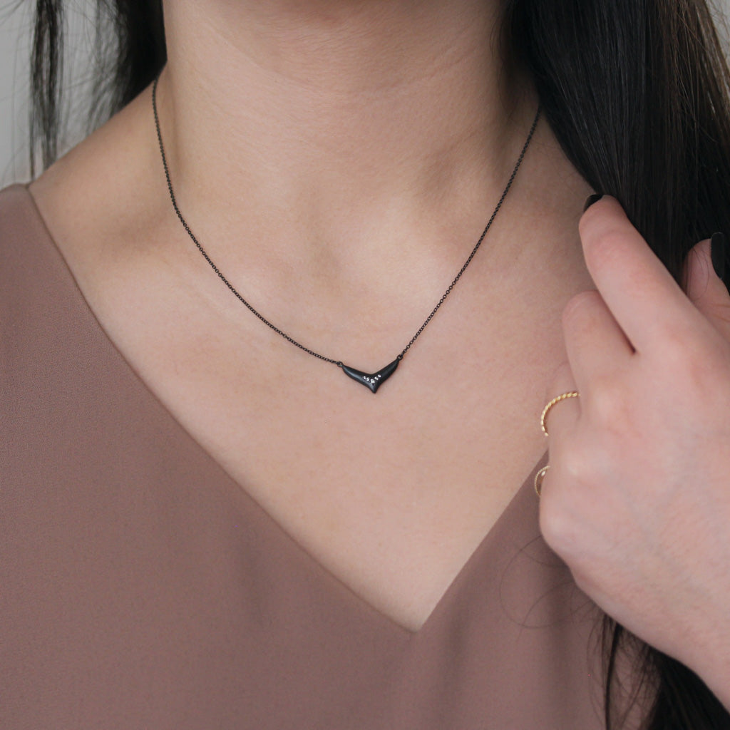 This necklace with a fin pendant, encrusted with pave diamond is made of Sterling silver and has a total of 5 white diamonds. It has a total length of 16 inches.