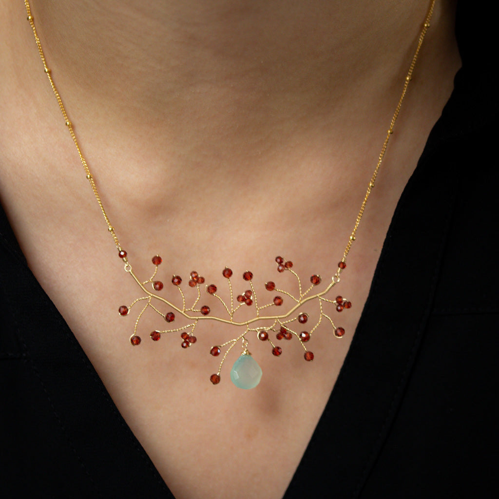 Chalcedony and Garnet dangle from a delicate hand twisted 14K gold-filled wire.
