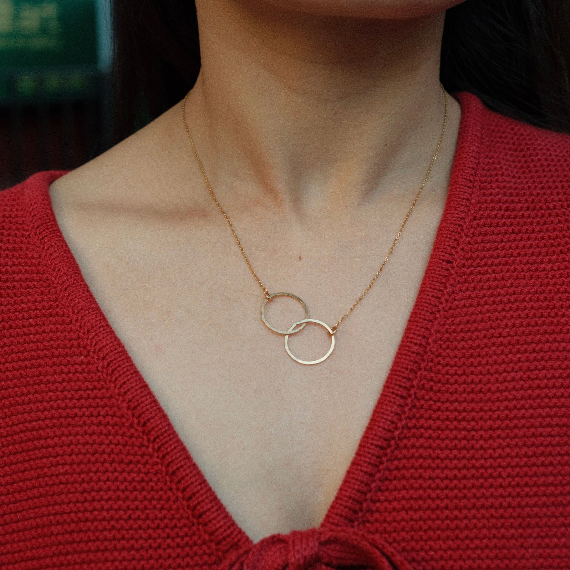 This 18" necklace features a double hammered circle pendant crafted in 14k gold-filled material, offering a refined and elegant accessory.