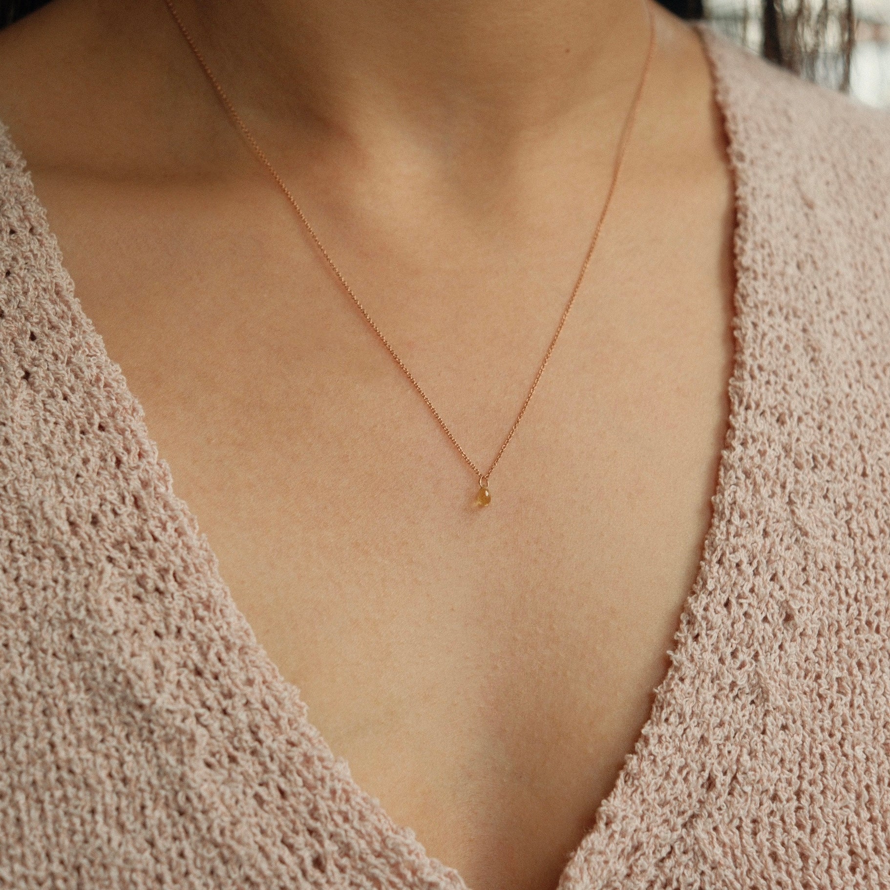 This 18-inch necklace features a delicate drop of tiny yellow sapphire set in 10K rose gold, blending elegance with subtle brilliance.