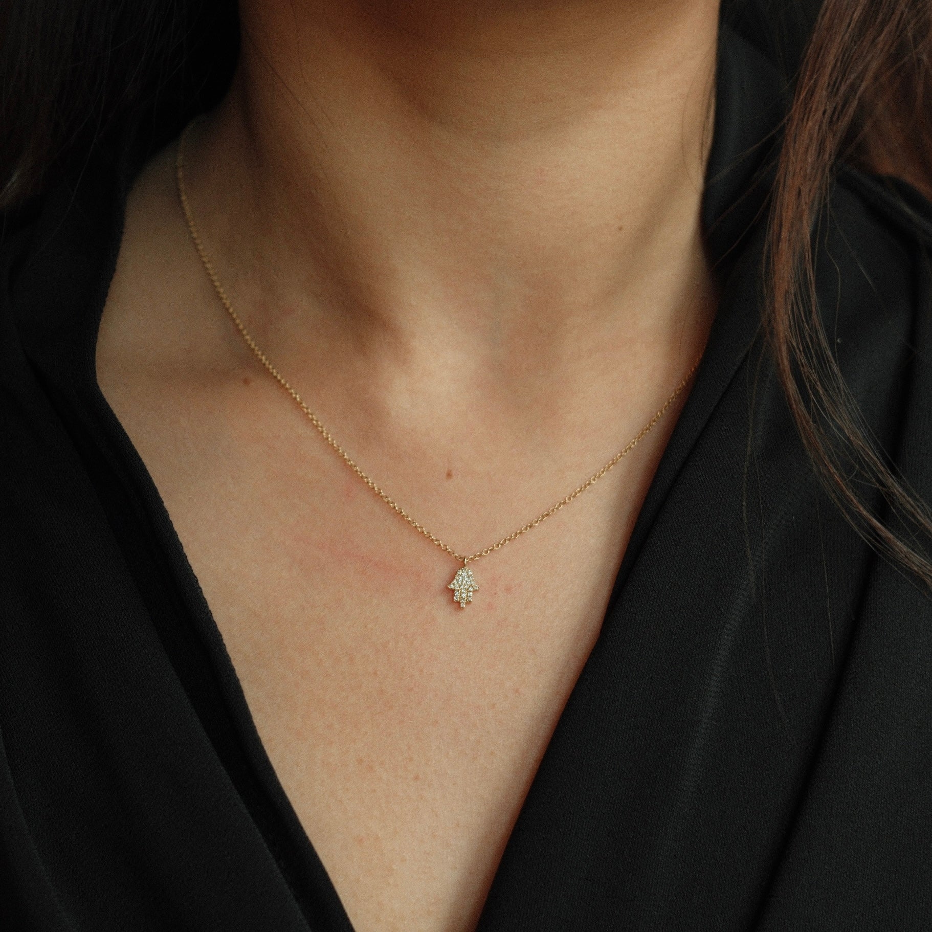 This elegant 14K yellow gold Hamsa necklace features delicate diamonds totaling 0.06ct, weighing 1.71 grams, and offers an adjustable length between 16" and 18".