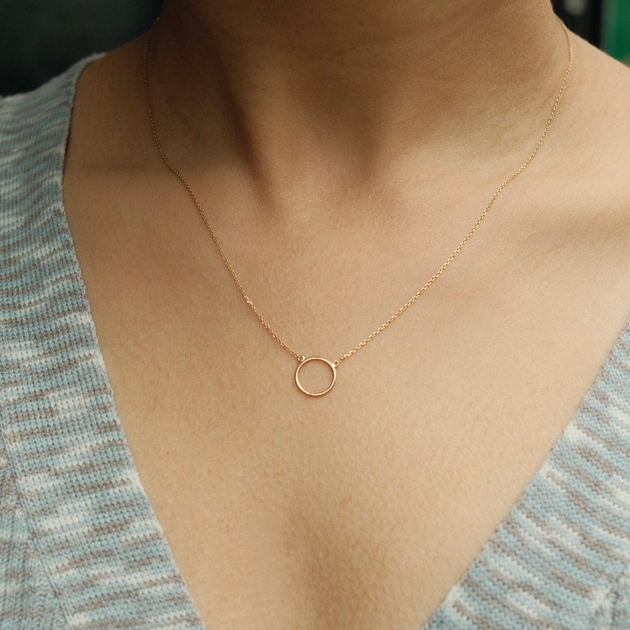 This 14K gold circle necklace has an infinite ring attached to a delicate solid gold chain. This necklace has a half inch circle ring on a 16" chain with a 2" extender for the perfect fit.