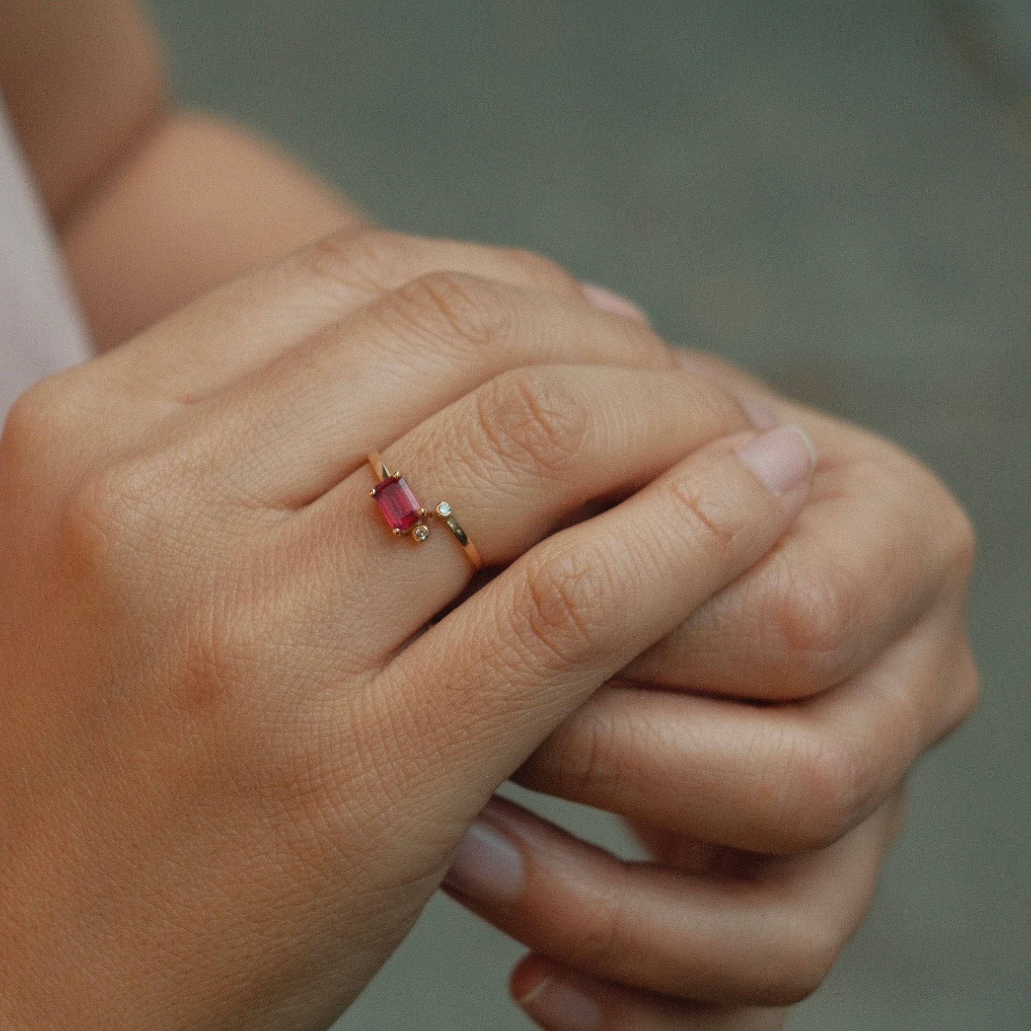 This open ring crafted from 14k gold features a 0.65ct ruby accentuated by a delicate 0.03ct diamond, blending elegance with refined craftsmanship. Only available in size #6.