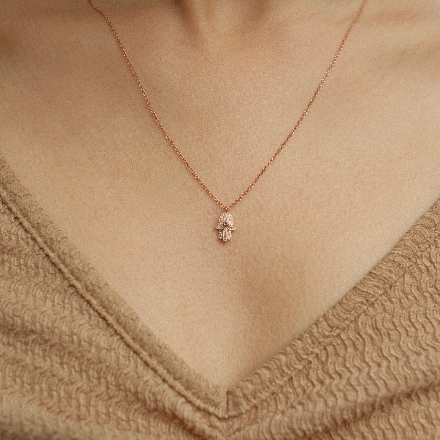 Elevate your style with this 14k gold Hamsa necklace featuring 26 diamonds totaling 0.09 carats and a 0.1-carat sapphire. Weighing 1.90 grams, it measures between 16" and 18" for a perfect fit.