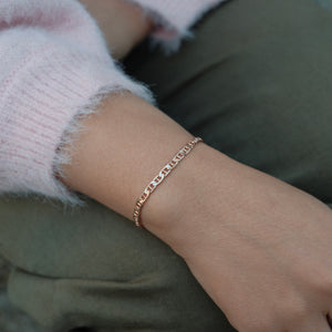 This delicate bracelet features a sterling silver chain with a lustrous 14k rose gold plating, measuring 7 inches in length. Perfect for everyday wear or layering with other pieces.